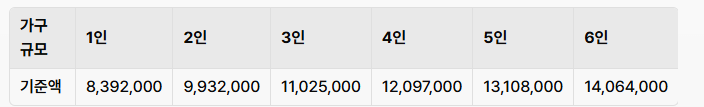 1인 기준: 179만 4,010원 이하 4인 기준: 457만 3,330원 이하 (가구 규모별 자세한 기준은 변동될 수 있습니다.)