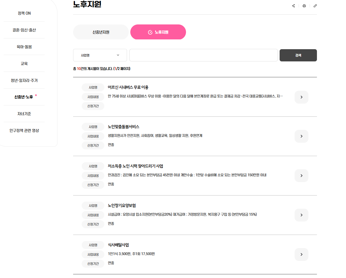 그림을 누르면 아래 사진처럼 노후지원 사업을 확인하실 수 있는데